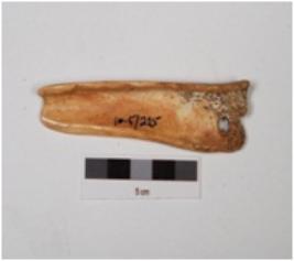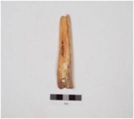 | Description / विवरण | A scraper made of bone with slightly broken tip, natural hole on the other side with porous end and well polished surface. |