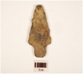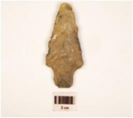 | Description / विवरण | An arrow head made of chert, tanged, flake scars on the surface and retouches on edges. |