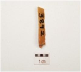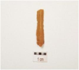 | Description / विवरण | Chert, parallel sided blade with a prominent ridge on dorsal side, broken from both ends, irregular retouches on cutting edge and triangular in section. |