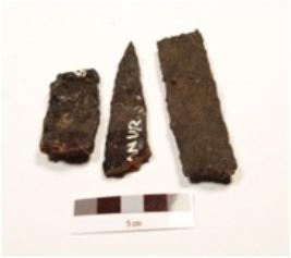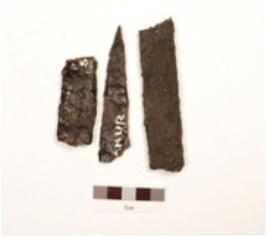 | Description / विवरण | Fragments of an iron knife, broken into three pieces, pointed top, uneven surface and edges. |