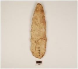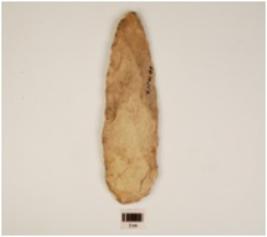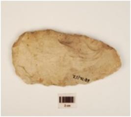 | Description / विवरण | A handaxe made of chert, flake scars on the surface and retouches on working edges. |