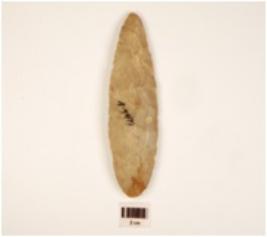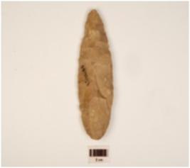 | Description / विवरण | A spearhead made of chert, flake scars on the surface and retouching on edges. |