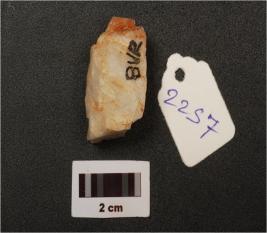 | Description / विवरण | Quartz core with prepared platform, five flake scars, diffused bulb on ventral side, use wear mark along cutting edges, |
