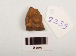 | Description / विवरण | Laterite nodule core with prepared, diffused bulb on ventral side, use wear marks along cutting edges |