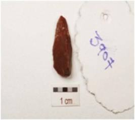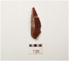 | Description / विवरण | Chert, blade on core with three blade scars, pointed along at one end and pointed along at one end, use wear marks on cutting edges. |