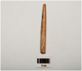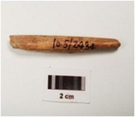 | Description / विवरण | Fragment of a bone point, polished and partly broken surface, broken from both ends, brown in colour and rectangular in section. |
