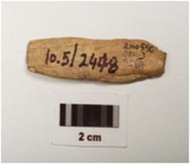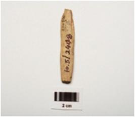 | Description / विवरण | A bone tanged point with partly broken tang, smooth surface with crack marks broken from both ends, light brown in colour and rectangular in section. |