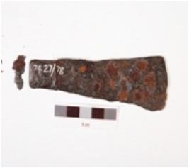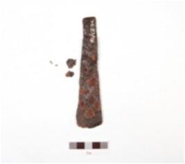 | Description / विवरण | Fragment of iron chisel, partly broken, flat top, broad and flat from bottom, proper edges, rough surface and rusted. |