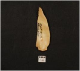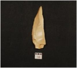| Description / विवरण | A blade made of chert, prepared striking platform on proximal end, pointed distal end, partly retouched cutting edge, blunted one lateral side, two ridge on dorsal surface, irregular triangular cross section. |