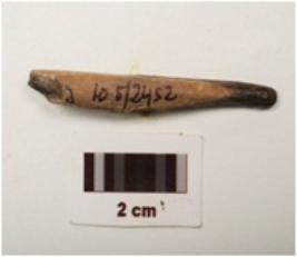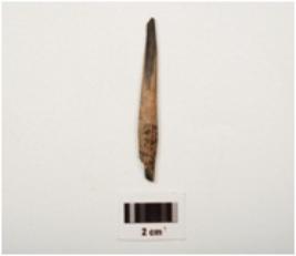 | Description / विवरण | Fragment of a charred bone point with a pointed end, smooth surface with crack marks, partly broken from other end, light brown in colour and oval in section. |