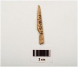 | Description / विवरण | Fragment of a bone point, smooth surface with a pointed end, partly broken from other end, light brown in colour and rectangular in section. |