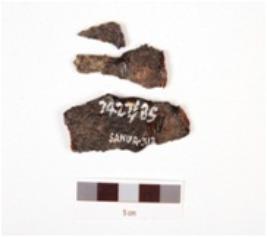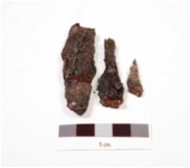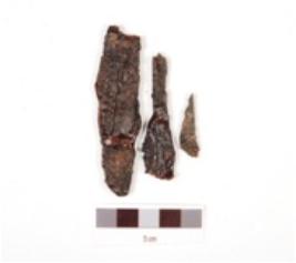 | Description / विवरण | Fragment of iron spearhead, broken in three pieces, uneven surface and long tang. |