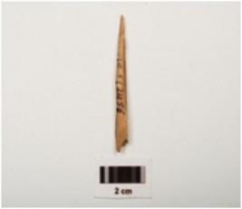 | Description / विवरण | A bone point with a pointed end, polished surface, partly broken from both ends, light brown in colour and square in section. |