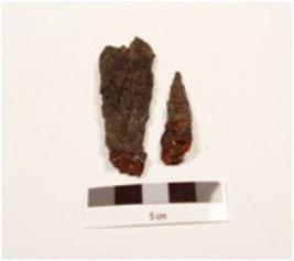 | Description / विवरण | Fragments of an arrow head made of iron, broken into two pieces, uneven surface, pointed top. |