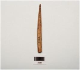 | Description / विवरण | A bone point with polished surface and one pointed end partly broken from ends light brown in colour and oval in section |