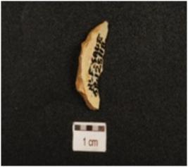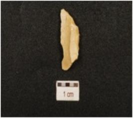 | Description / विवरण | A lunate made of chert, pointed both ends, sharp cutting edge, partly broken, blunted one lateral side, flake scars on surface and triangular cross section. |