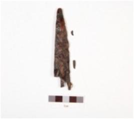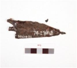| Description / विवरण | Iron arrowhead, pointed top and barbed, broken tang and rough surface. |