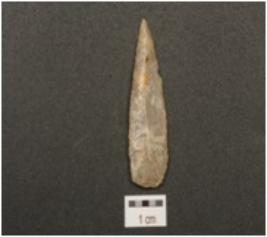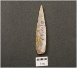 | Description / विवरण | A utilized flake made of chert, prominent bulb on ventral side, proximal end is partly broken and other end is pointed use wear marks along the working edge. |