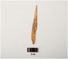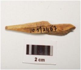 | Description / विवरण | Fragment of a bone point, polished surface with slightly broken pointed end, partly broken from other end and light brown in colour |
