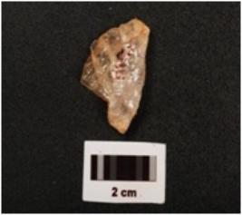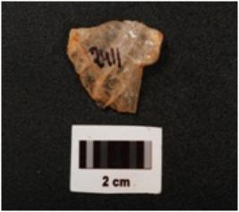 | Description / विवरण | Fragment of blade made with quartz prominent bulb on ventral side, use- wear marks on working edge, smooth surface, |