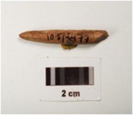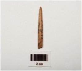 | Description / विवरण | Fragment of a bone point, polished surface with crack marks, one pointed end partly broken from other end brown in colour and circular in section |