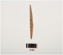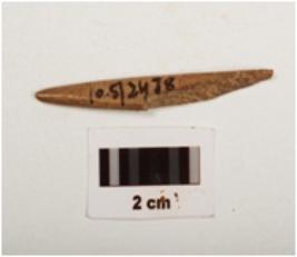 | Description / विवरण | Fragment of a bone point, polished surface with a pointed end, partly broken, brown in colour and rectangular in section. |