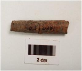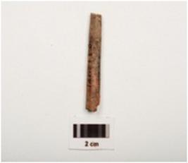 | Description / विवरण | Fragment of a bone point polished surface, broken from both ends, brown in colour and circular in section |