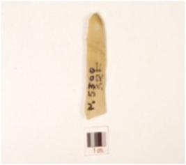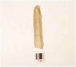 | Description / विवरण | A chert blade with trapezoidal cross section, prominent bulb on ventral side, distal end broken, prepared platform, use-wear marks along the cutting edges and double ridge on dorsal side. |