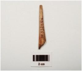 | Description / विवरण | Fragment of a bone point, polished surface with partly broken both ends, brown in colour and square in section. |