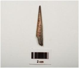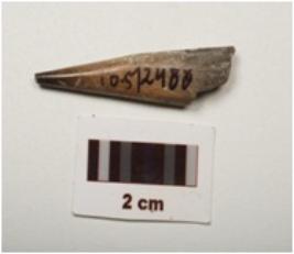 | Description / विवरण | Fragment of a point made on charred bone, polished surface with a pointed end partly broken from other end, dark brown in colour and rectangular in section |