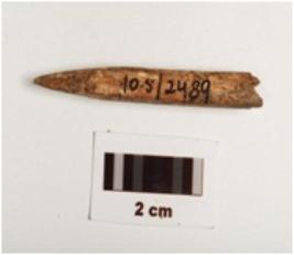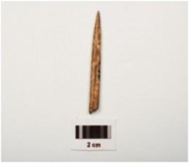 | Description / विवरण | Fragment of a bone point, polished surface with a pointed end and crack marks pratly broken from other end dark brown in colour and square in section |