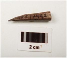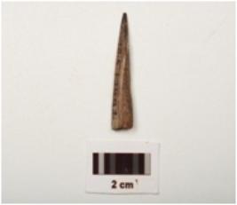 | Description / विवरण | Fragment of bone point , polished surface with a prominent ridge and one pointed end partly broken at other end dark brown in colour and tirangular in section, |