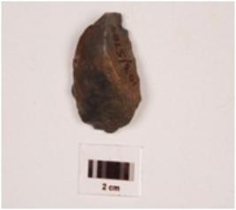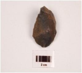 | Description / विवरण | A scrapper made of chert with flake scars on the surface, it has diffused bulb on the ventral side, irregular retouch along the cutting edges. |