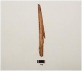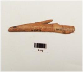 | Description / विवरण | Long bone harpoon with one barb, polished surface, lenticular in section and partly broken from both ends, one crack mark on surface and two marks on edge, brown in colour |