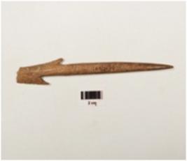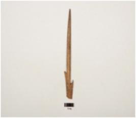 | Description / विवरण | Long bone harpoon with two pointed barbs one is partly broken, polished surface lenticular in section from broken end pointed at other end, |