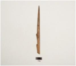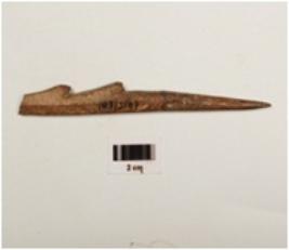 | Description / विवरण | Long bone harpoon with partly broken two barbs, polished surface, oval in section from broken end and pointed at other end, grey in colour broken and mended |