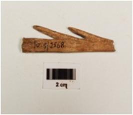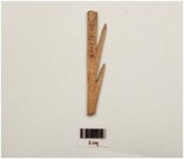 | Description / विवरण | Bone harpoon with two barbs, long in size, pointed at one end and square in section from broken end, light brown in colour, broken and mended |