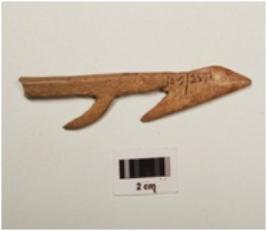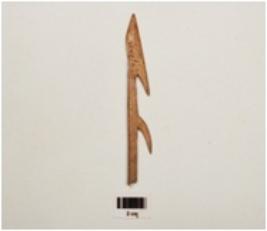 | Description / विवरण | Bone harpoon with two sharp pointed barbs , pointed at one end and polished surface, circular in section, brown in colour and broken from one end, |
