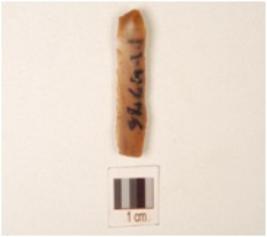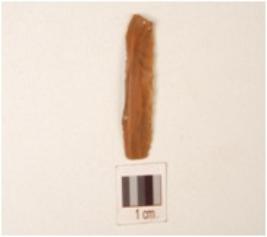 | Description / विवरण | A chert blade with trapezoidal cross section, use-wear marks along the cutting edge, broken from both ends, bulb absent and double ridge on dorsal side. |