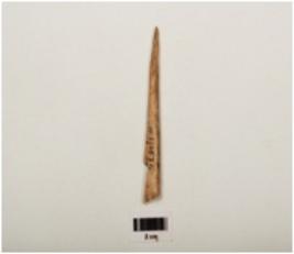 | Description / विवरण | Bone harpoon with partly broken one barb, smooth and three incised line on surface, pointed towards pointed end and broken from other end, circular in section and light brown in colour |