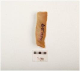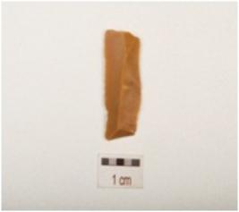 | Description / विवरण | Fragment of chert parallel sided blade with prominent mid ridge on dorsal, triangular section, use wear marks on cutting edge, broken along proximal end. |