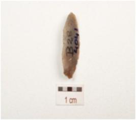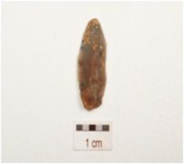 | Description / विवरण | A chert blade with prominent mid ridge on dorsal, triangular in section, diffused bulb on ventral and use wear marks on cutting edge. |