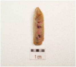 | Description / विवरण | A chert blade with double ridge on dorsal, trapezoidal in section, diffused bulb on ventral and use wear marks on cutting edge. |