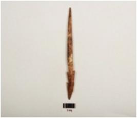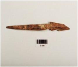 | Description / विवरण | Fragment of a bone point, polished surface with a pointed end, partly broken from other end, dark brown in colour and square in section. |