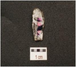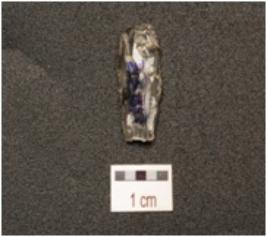| Description / विवरण | A quartz crystal blade with improminent double ridge on dorsal, trapezoidal section, use wear marks on cutting edge and broken along proximal end. |