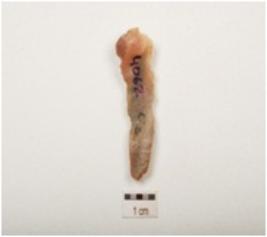 | Description / विवरण | A chalcedony blade with double ridge on dorsal, trapezoidal section, bulb on ventral and use wear marks on cutting edge. |