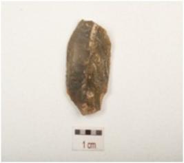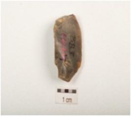 | Description / विवरण | A chert blade with double ridge on dorsal, trapezoidal section, slightly chipped off diffused bulb on ventral and use wear marks on cutting edge broken along distal end. |