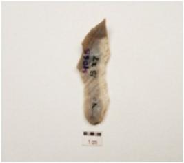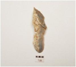 | Description / विवरण | A chalcedony blade with improminent mid ridge on dorsal, bulb on ventral , triangular section and use wear marks on cutting edge. |