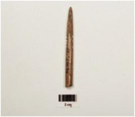 | Description / विवरण | A bone with well polished surface, pointed from one end and partly broken from both ends, circular in section with vertical crack marks and brown in colour |