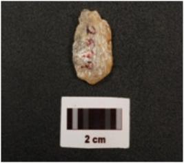 | Description / विवरण | Quartz end struck flake with striking platform, diffused bulb on ventral side, flake scars on dorsal side, slightly cortex visible and use, wear marks on edges |
